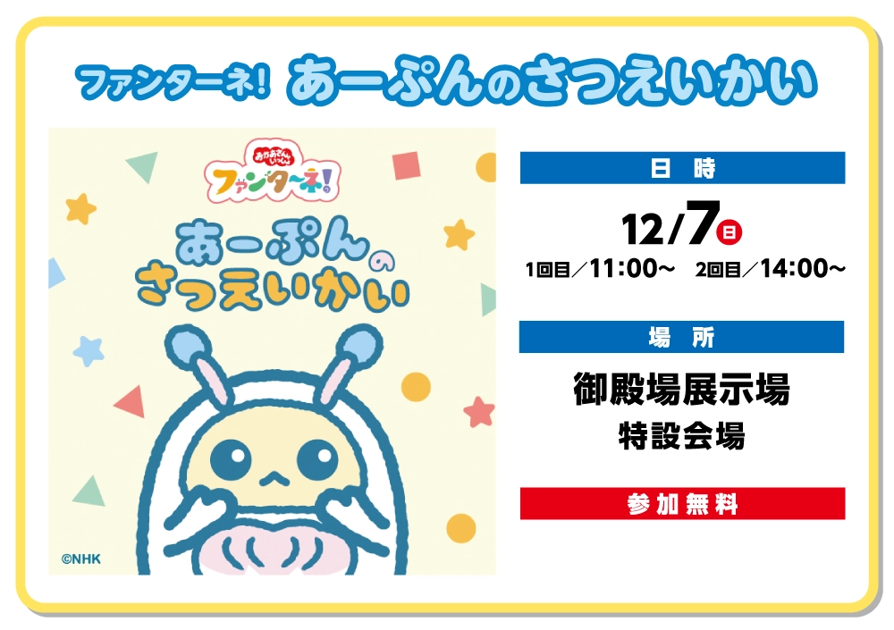 NHK Eテレ「おかあさんといっしょ」内の人気コーナー「ファンターネ!」のあーぷんが着ぐるみになって登場します。