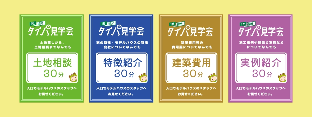 土地相談、特徴紹介、建築費用、実例紹介4つのカードをご用意!