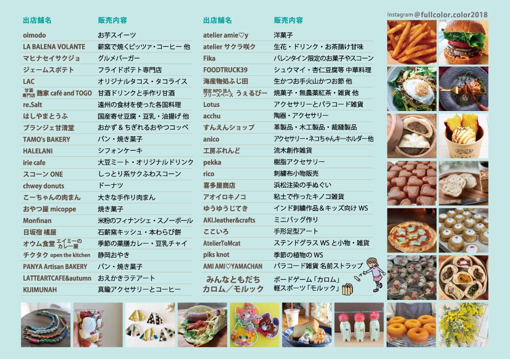| 備考 | 雨天決行/荒天中止(※警報発令の場合は中止) 詳しくは公式instagramをご覧ください @fullcolor.color2018 ※イベントは、予告なく変更となる場合がございます。 |