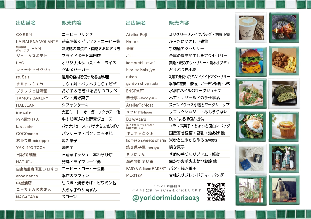 | 備考 | 詳しくは公式instagramをご覧ください @yoridorimidori2023 ※イベントは、予告なく変更となる場合がございます。 |