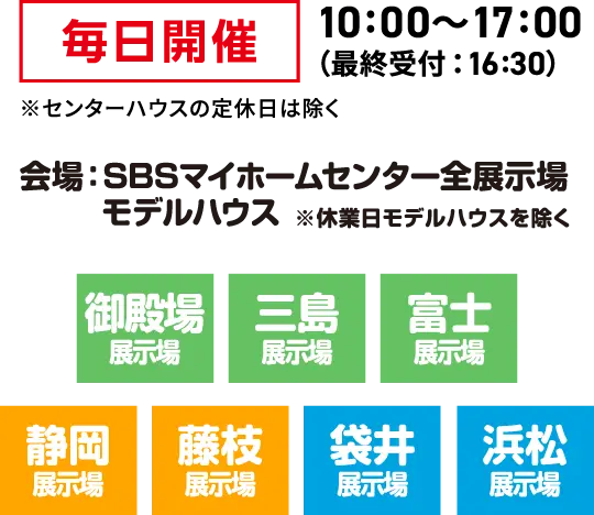 静岡県内7ヶ所の展示場で開催しています。お近くの展示場で、ぜひご参加ください!