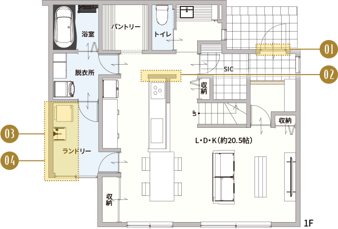 子育て世帯の一日をイメージし、日々の家事が少しでもラクになるタイパにこだわった家事動線をプランニング。ムダのないスムーズな動線で忙しい時間帯にも心と時間のゆとりを生み出し、家族みんなが迷わず動けて心地よく片付く間取りです。AQ Grandは「タイパ・スペパ・コスパ」にこだわった、家族みんなが笑顔で過ごせる住まいをお届けします。