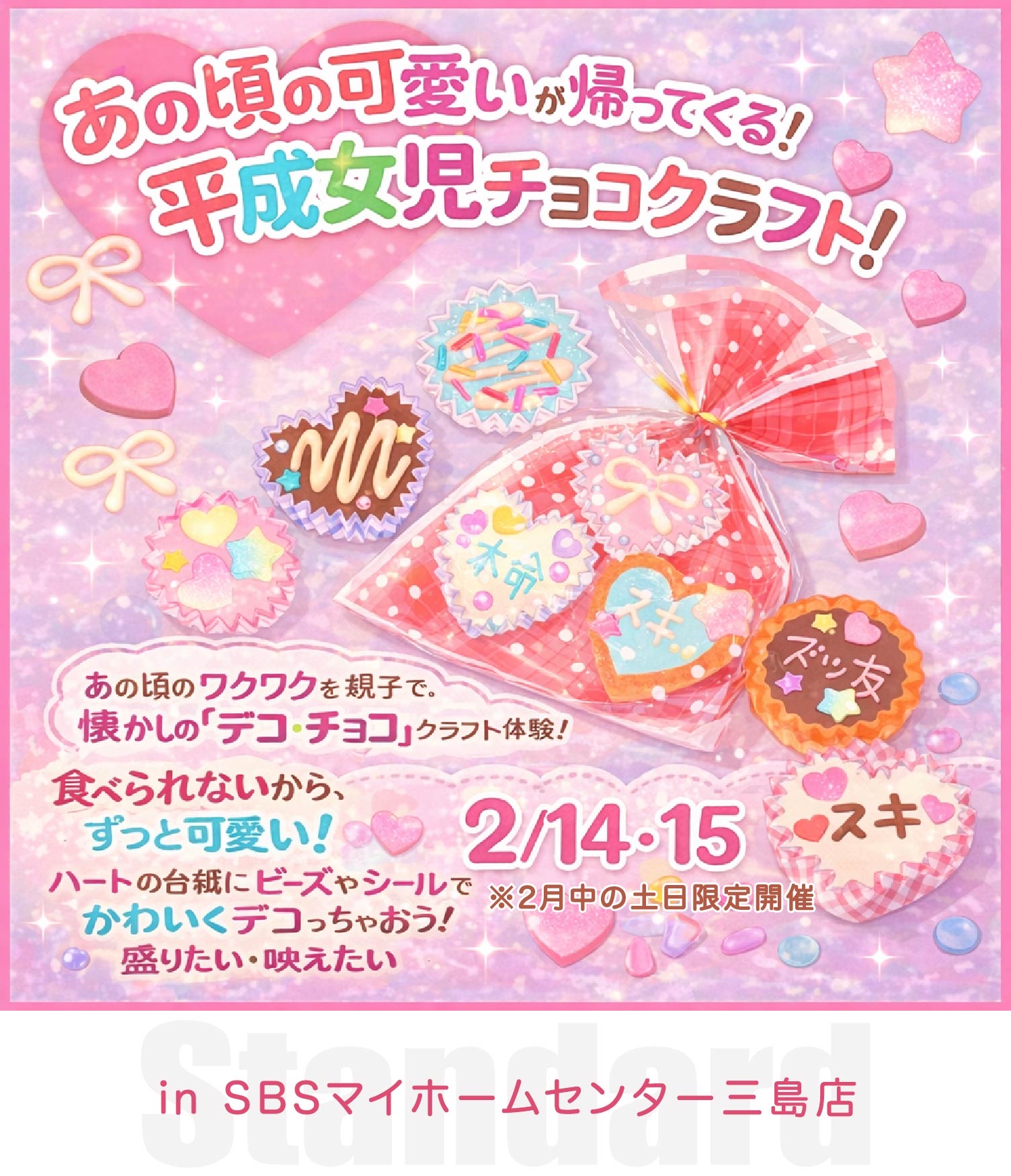 「ズッ友」「本命」「スキ」…懐かしのあのワードが復活!? 2月の土日は、Standard SBSマイホームセンター三島店にて、平成レトロな「デコ・チョコ」クラフトイベントを開催します。