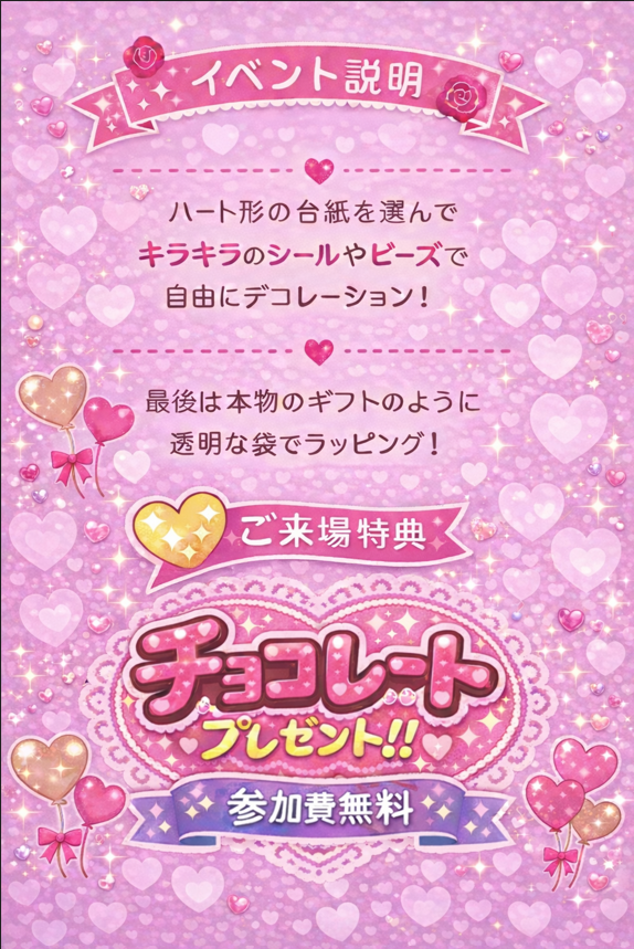 ハートの台紙にビーズやシールでデコるだけ。食べられないからずっと飾っておける、自分だけの「可愛い」を形にしてみませんか?モデルハウス見学の合間に、お子様と一緒にワクワクするひとときを。ご来場特典として、本物のチョコレートもプレゼントいたします!