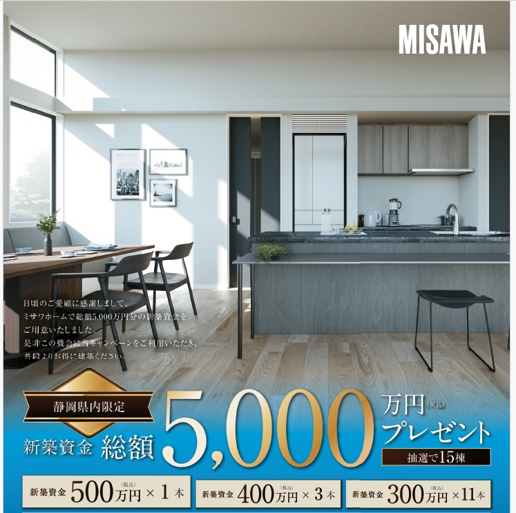 日頃のご愛顧を感謝しまして、ミサワホームで総額5000万円分の新築資金をご用意しました。