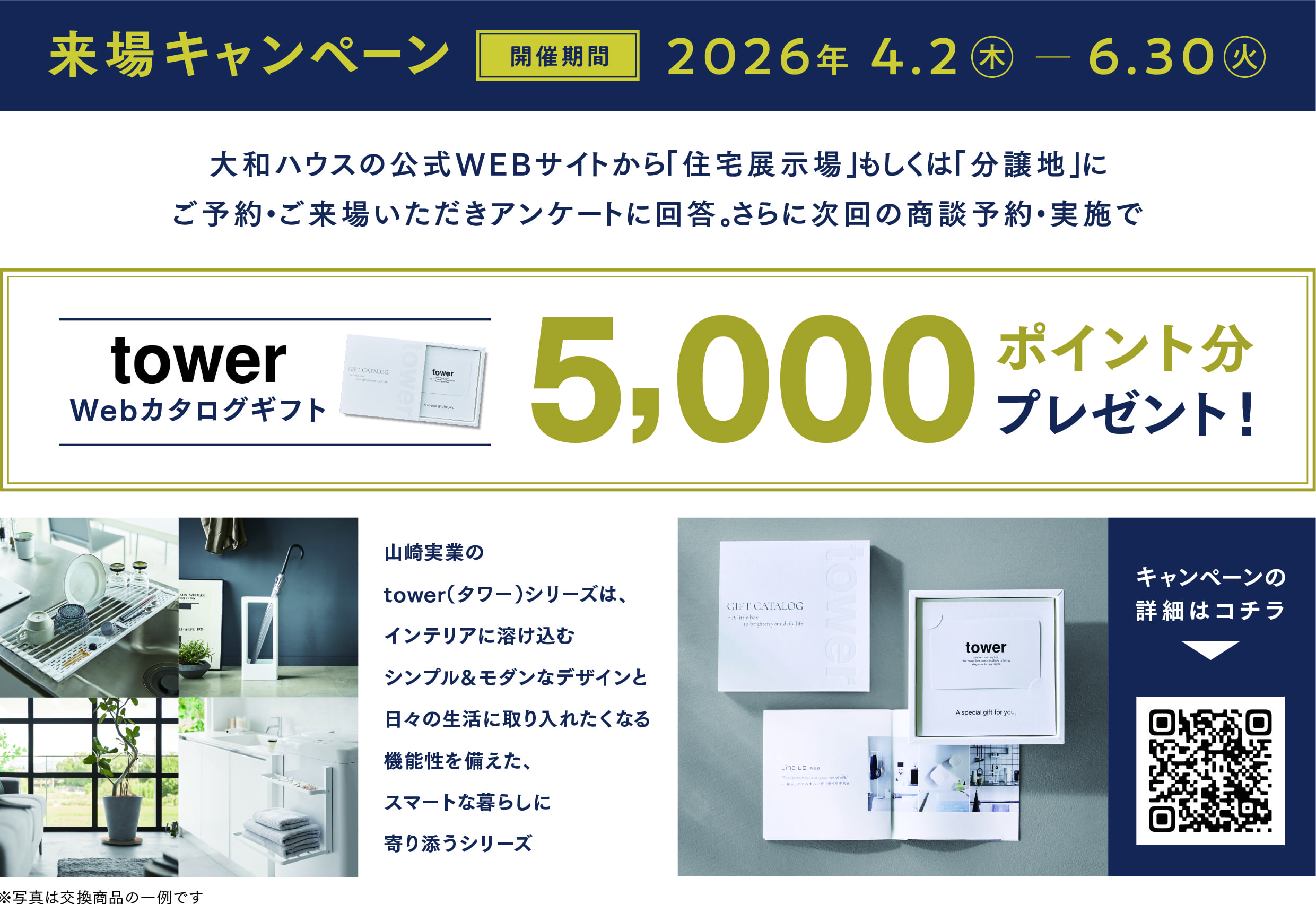 ダイワハウスの「住宅展示場」もしくは「分譲地」にご予約・ご来場いただきアンケートに回答。さらに次回の商談予約・実施でtower Webカタログギフト5,000ポイント分プレゼント!
