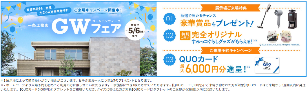 【一条工務店】⭐GWフェア⭐ご来場キャンペーン開催中!ご予約でさらにクオカードプレゼント中♪