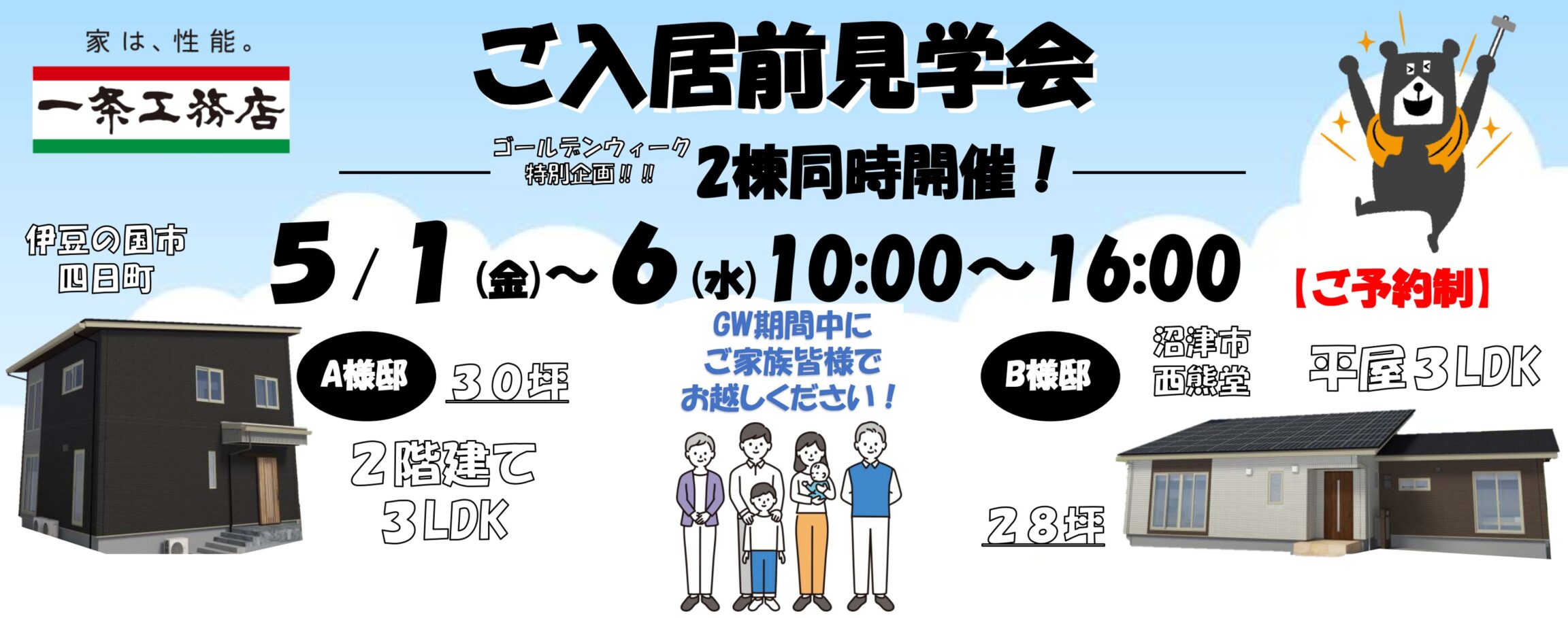 GW特別企画☆彡2棟のご入居前のお家をご覧いただけます!【伊豆の国市・2階建て3LDK&沼津市・平屋3LDK】5月1日(金)~6日(水)開催!