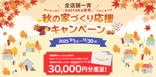 nattoku住宅に初めてのご来店+進呈条件を満たしますとAmazonギフト券30,000円分進呈!