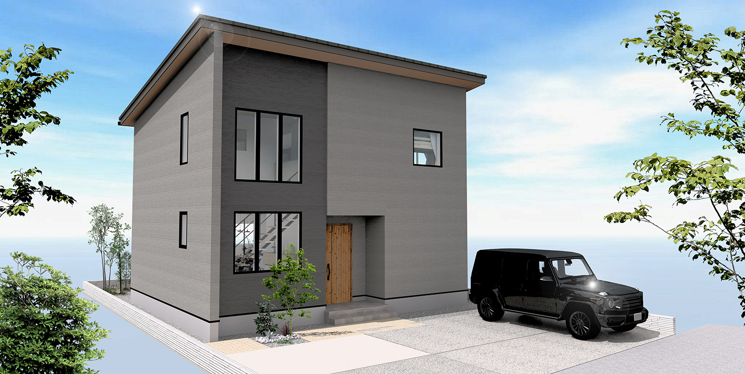 重厚感ある塗り壁の外観と木目の軒天が調和し、モダンで落ち着いた雰囲気を演出。ストリップ階段が空間に光を通し、明るさと開放感を両立。畳コーナーやオープンキッチンなど、日常を彩る工夫が詰まったデザインです。