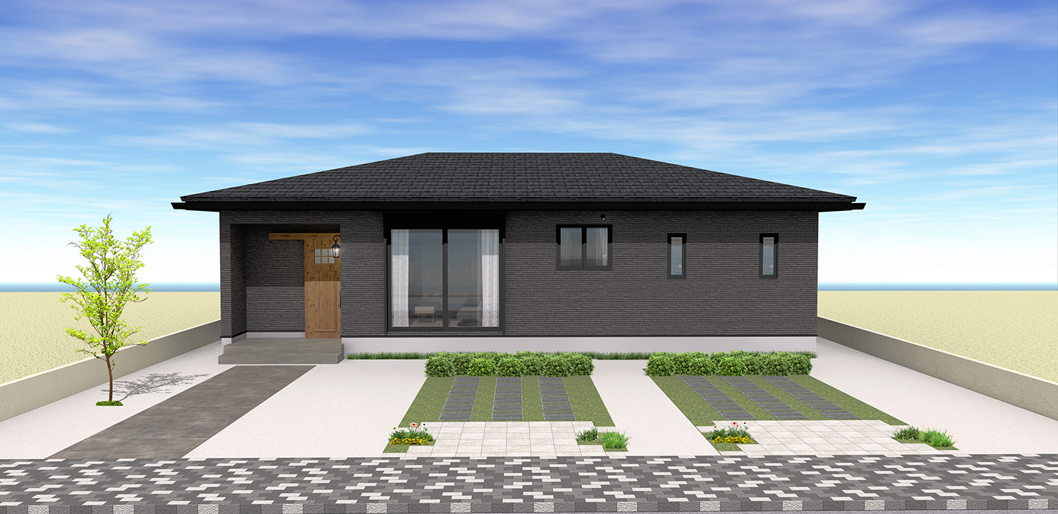 外観は黒の積石調デザインで落ち着きを演出し、玄関ドアのナチュラルな木目が温かく迎えます。