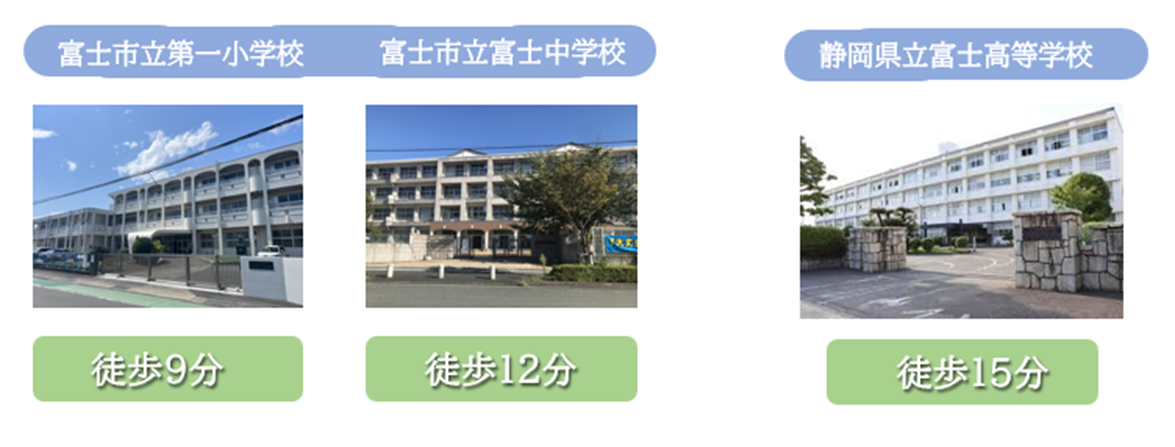富士市立第一小学校まで徒歩9分、富士市立富士中学校まで徒歩12分。