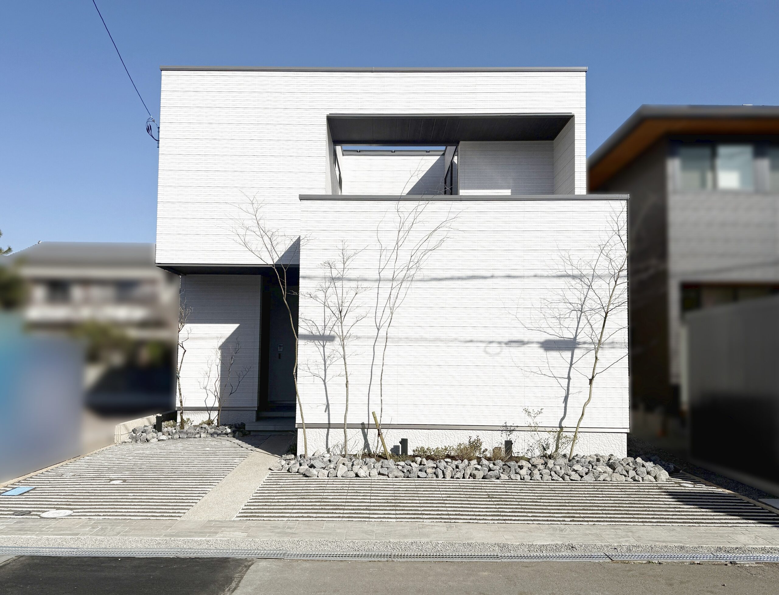 フラット屋根と植栽が織りなすスタイリッシュな外観