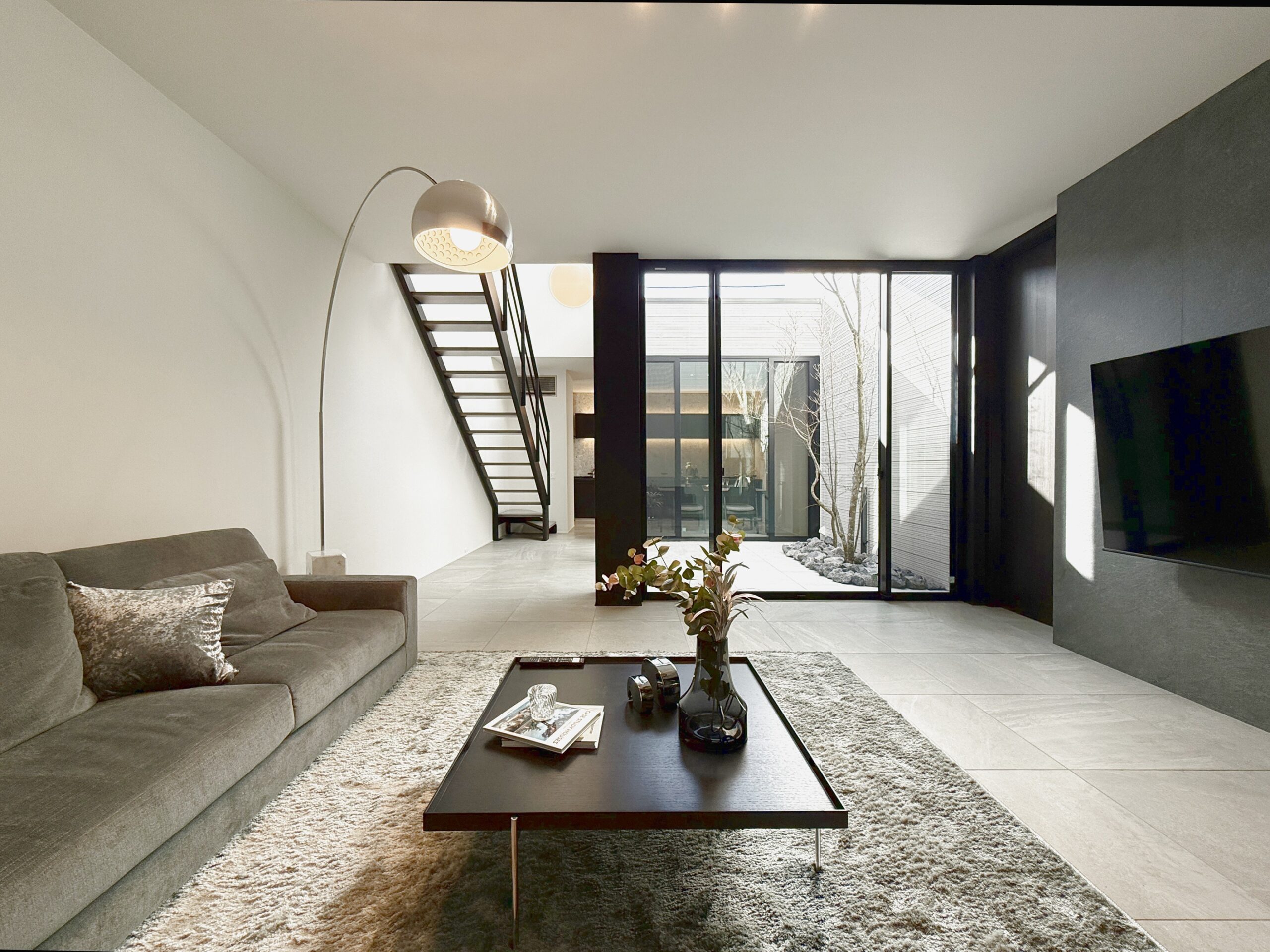 開放感とプライバシーを両立したコの字型のLDKで、ローコントラストで上品な内装デザインです。