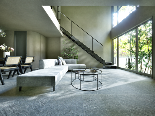 グレートーンでまとめたインテリアに、吹き抜けから降り注ぐ光が美しい陰影を生み出します。