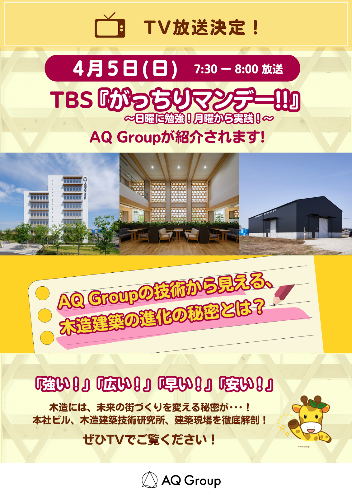 4月5日(日)7:30~放送のTBSテレビ「がっちりマンデー!!」にて、AQ Groupの木造技術が詳しく取り上げられます!