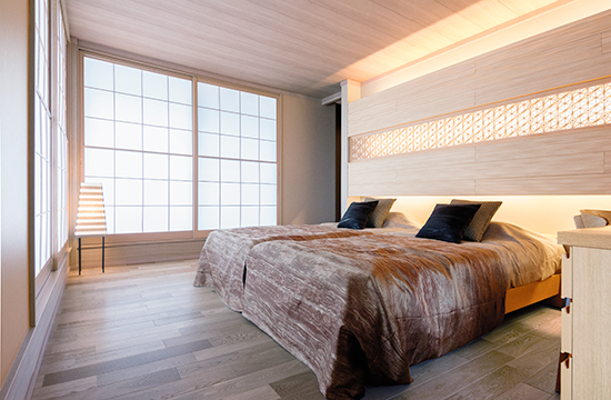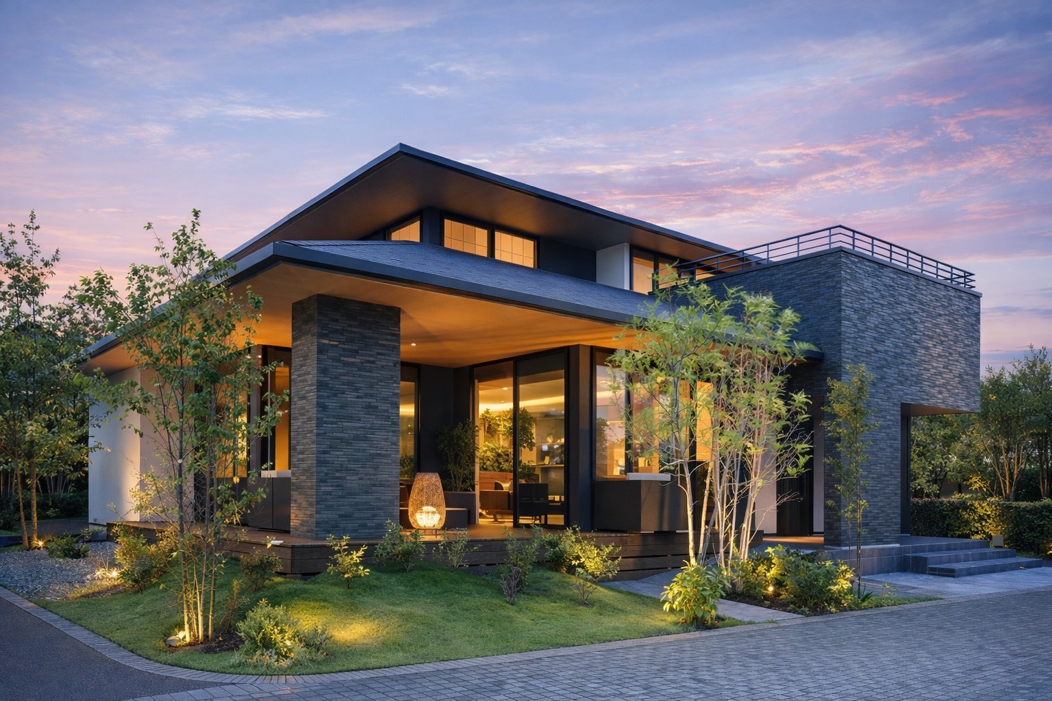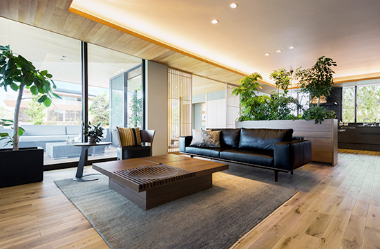 家族に癒しを与える開放感のあるLDKと木の表情と光を楽しむ住まい。連続する大開口がもたらす圧倒的な開放感を味わいながら、床・天井とウッドデッキや深い軒により、内と外が繋がる一体感を演出することで四季を楽しむことができる居心地のよい空間です。窓際に配した和室や深い軒による半外空間としても使えるウッドデッキ、テラスを設けており、大人気の平屋としてもイメージできます。1階は無垢『ナラ』とグレーを基調に色味を統一することで住まい全体に落ち着いた空間です。