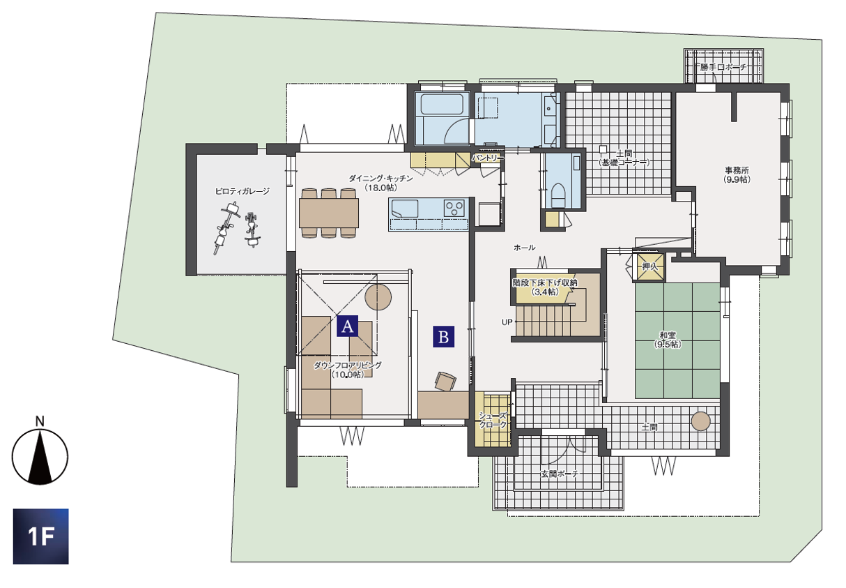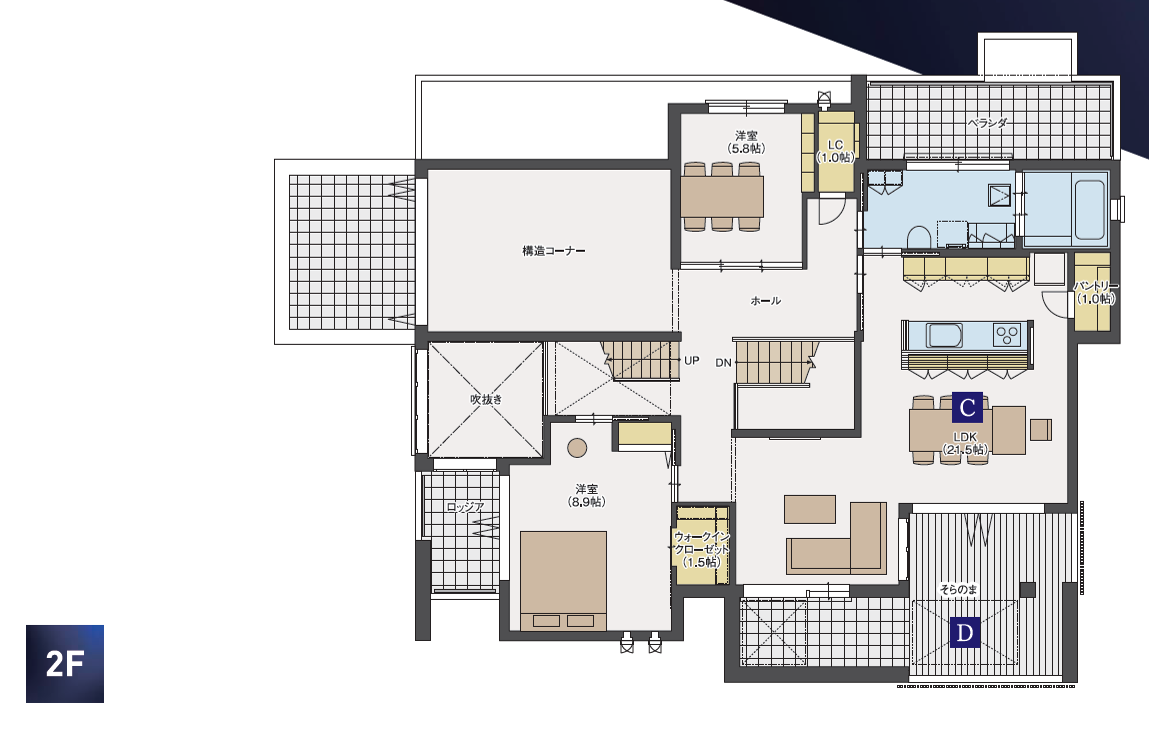 - ビルトインガレージ、ウッドデッキ、屋上利用、広いバルコニー、床暖房、浴室換気暖房、24時間換気システム、全館空調、掘りごたつ、ペアガラス、全開放サッシ、フラットサッシ(レベル)、レジリエンス住宅、高気密・高断熱構造