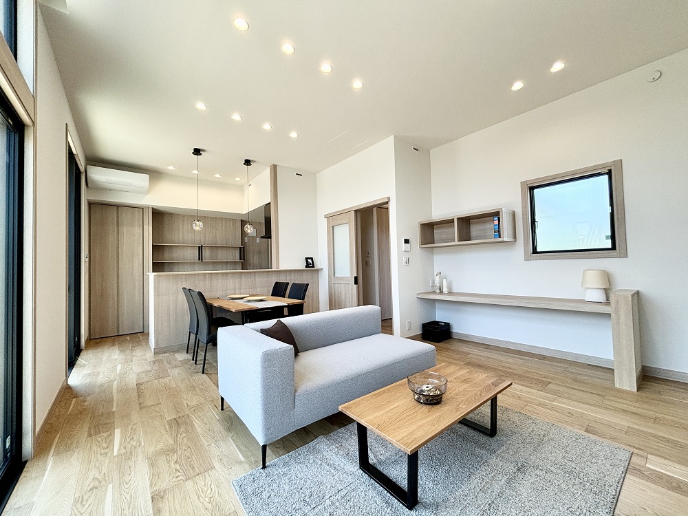 - ウッドデッキ、広いバルコニー、浴室換気暖房、24時間換気システム、ペアガラス、全開放サッシ、レジリエンス住宅、高気密・高断熱構造