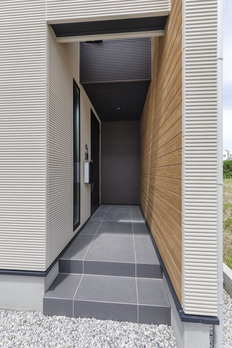 温かみのある玄関ポーチは3つの外壁材を使い分け、奥行きのある空間を演出。