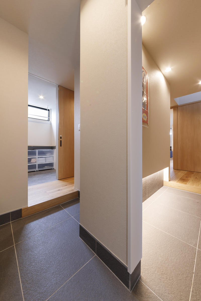 玄関からすぐに洗面室、脱衣室、浴室へとアクセス可能な回遊動線に。