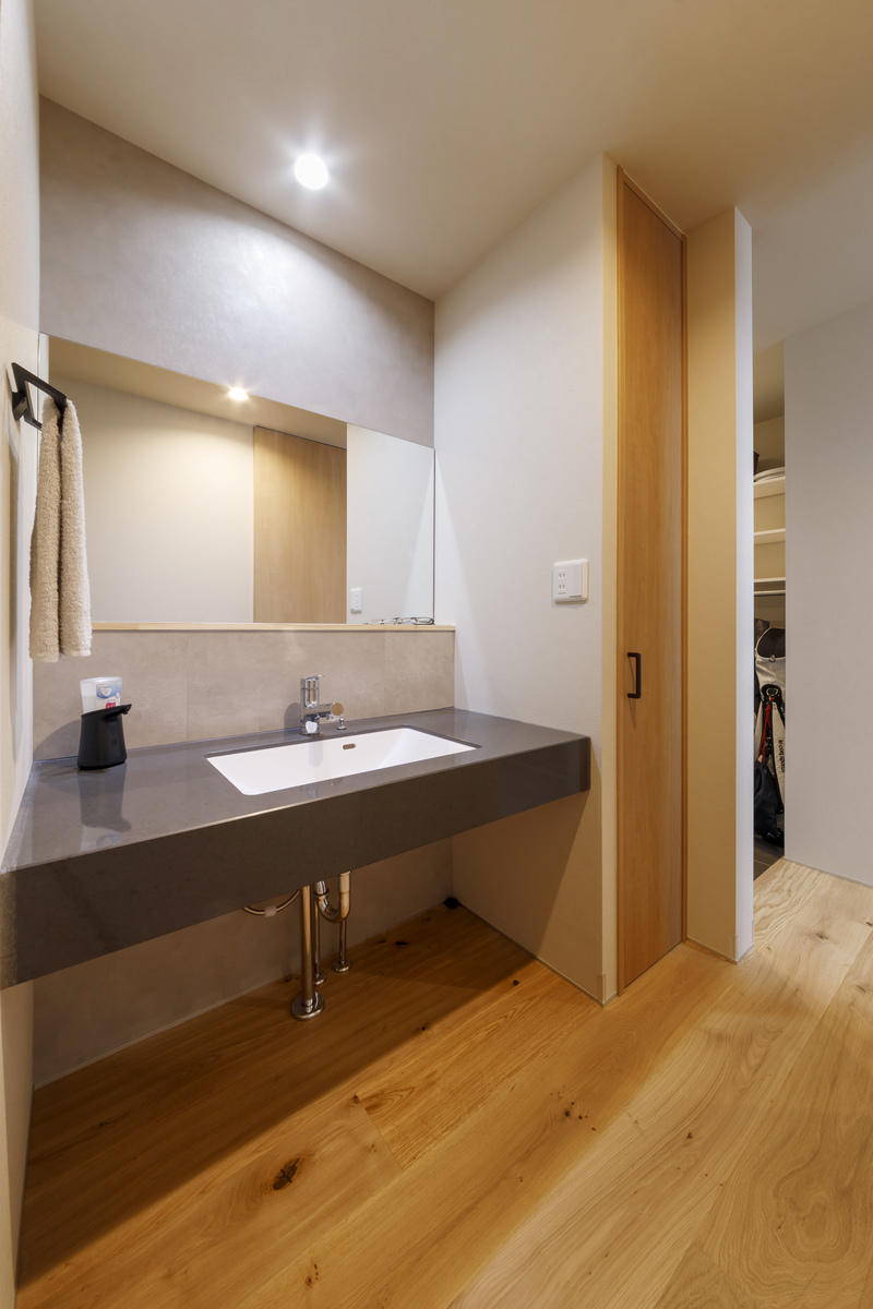 玄関から近い場所に設置された造作の手洗いコーナー。ワイドな洗面台と鏡をしつらえ、家族が横一列に並んで歯磨きできるスペースを確保しました。