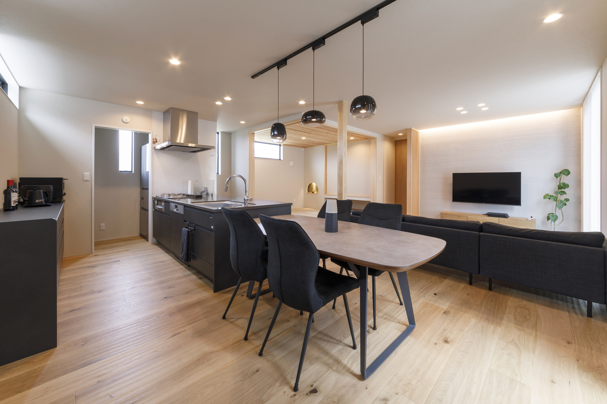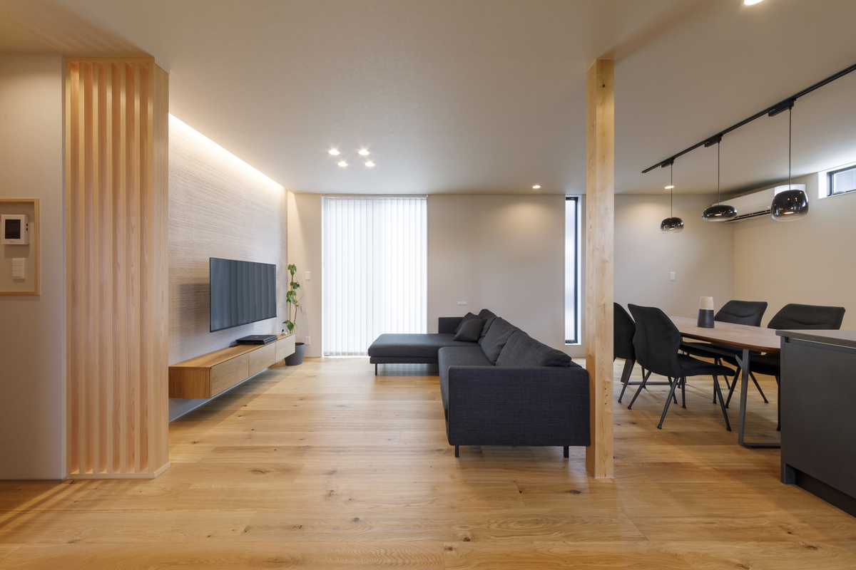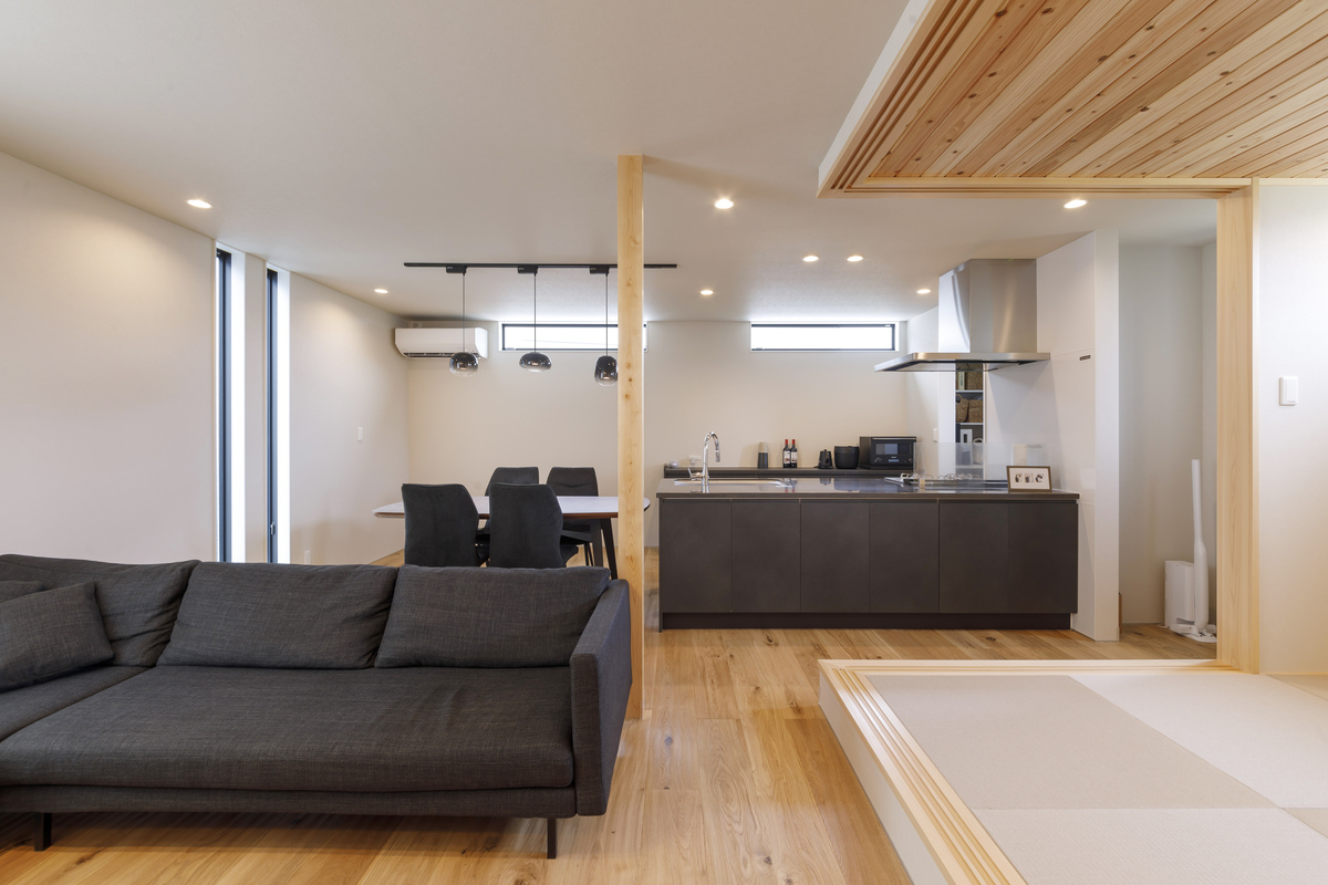 休日にはご主人も料理を手伝うため、キッチンのワークスペースを広めに確保。テレビ背面の壁には薩摩中霧島壁を採用。コーナーの格子がほんのりと和の趣きを醸し出しています。