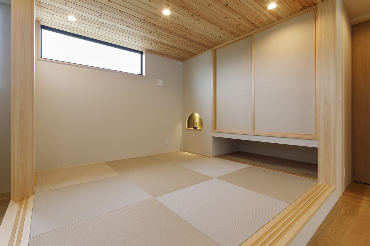 リビングに設けた個室としても使える和室。半円にくり抜いたニッチがかわいいアクセントになっています。