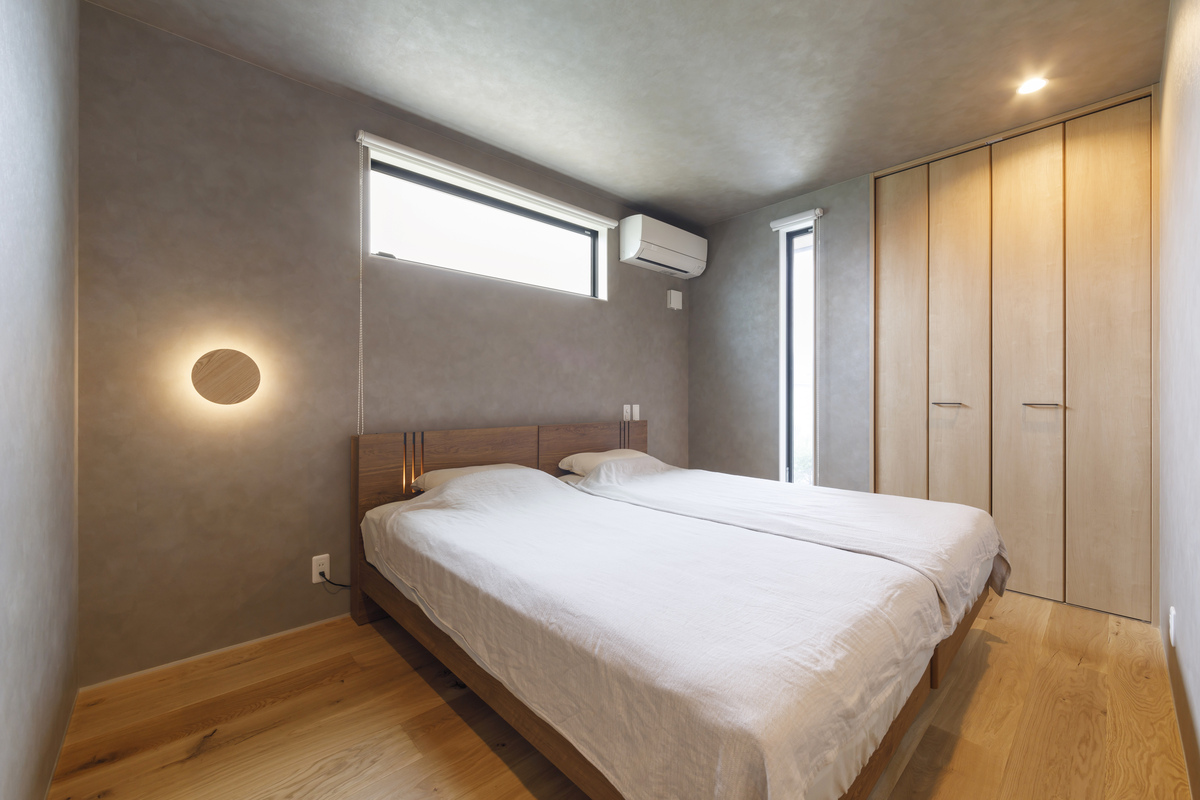 淡いグレーでコーディネートした寝室。間接照明が優しく灯ります。
