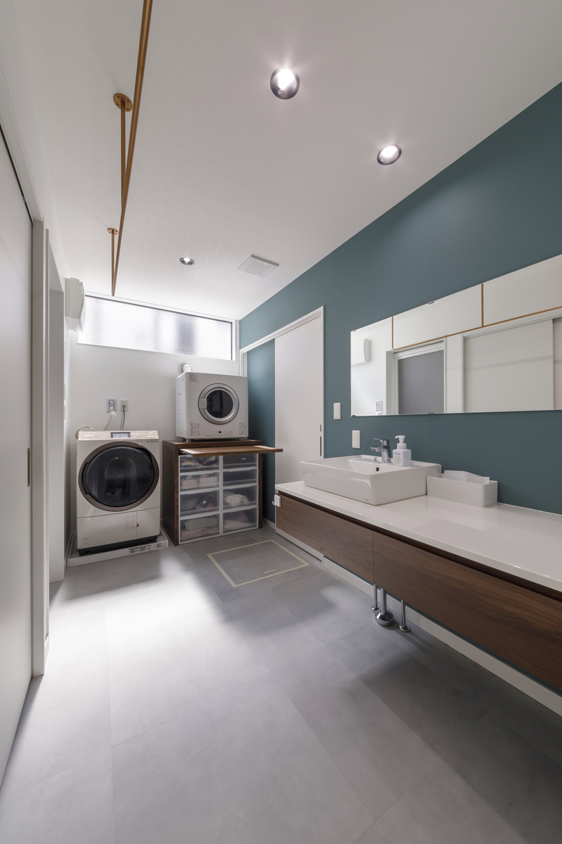 室内干しもできる広々とした洗面脱衣室。動線の良い洗面室を設けることで家事の負担を軽減させます。