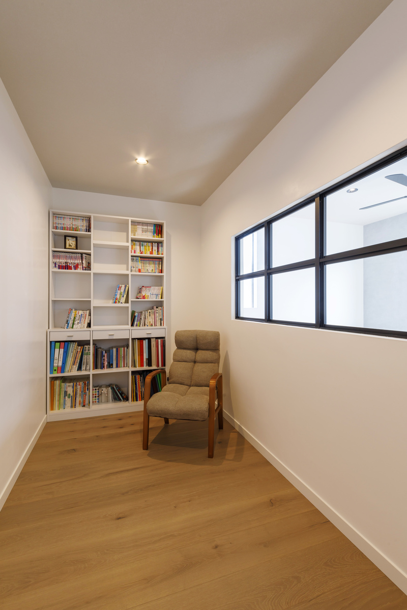 2階のフリースペースに設けたファミリーライブラリー。大容量の書棚を造作し、おこもり感のある空間で豊かな読書タイムを楽しむことができます。吹抜けに面したFIXのデコ窓はインテリアのアクセントにもなっています。