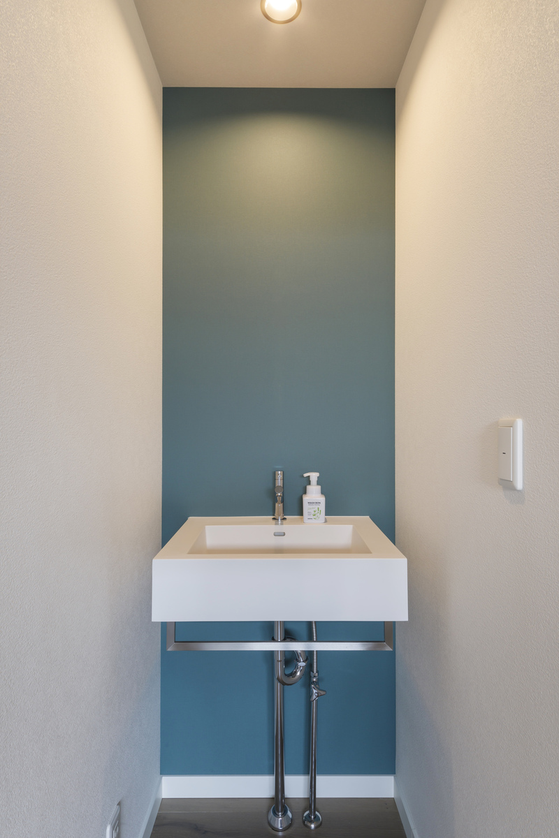 アクセントカラーを一面に入れることで奥行が増し、四角い洗面ボウルの存在も際立ちます。