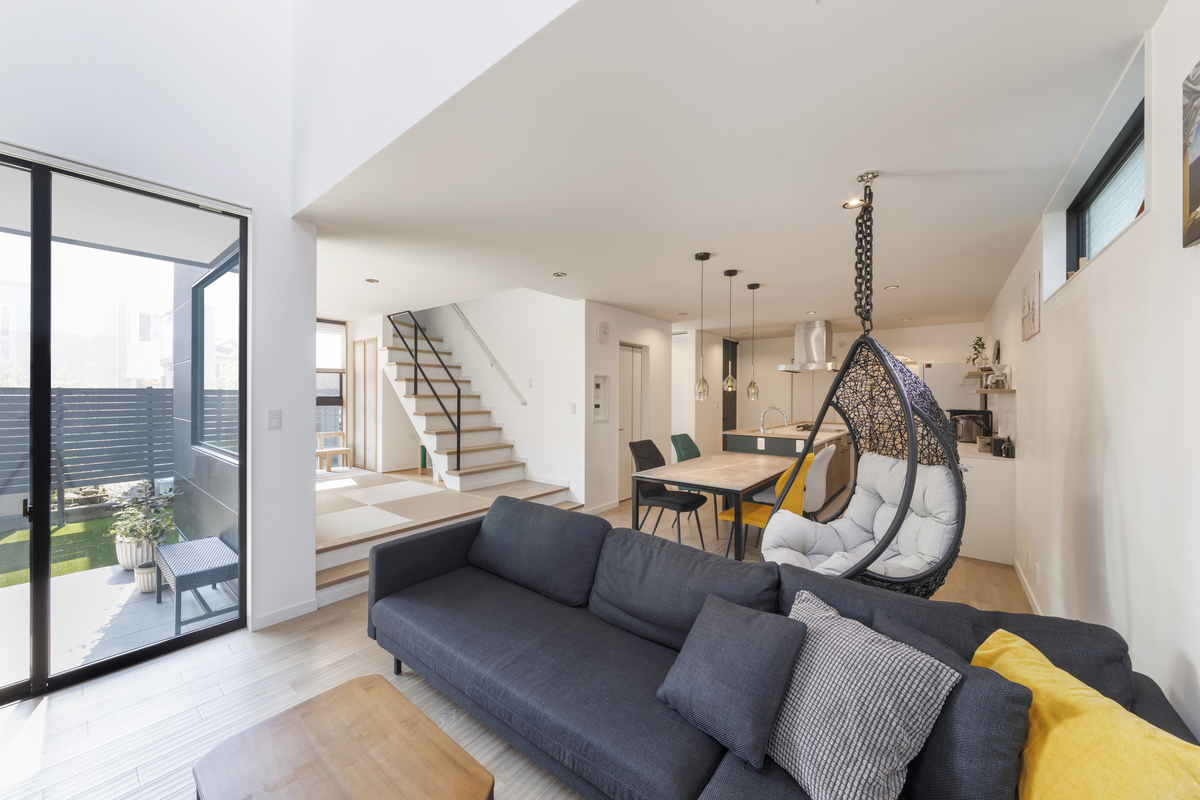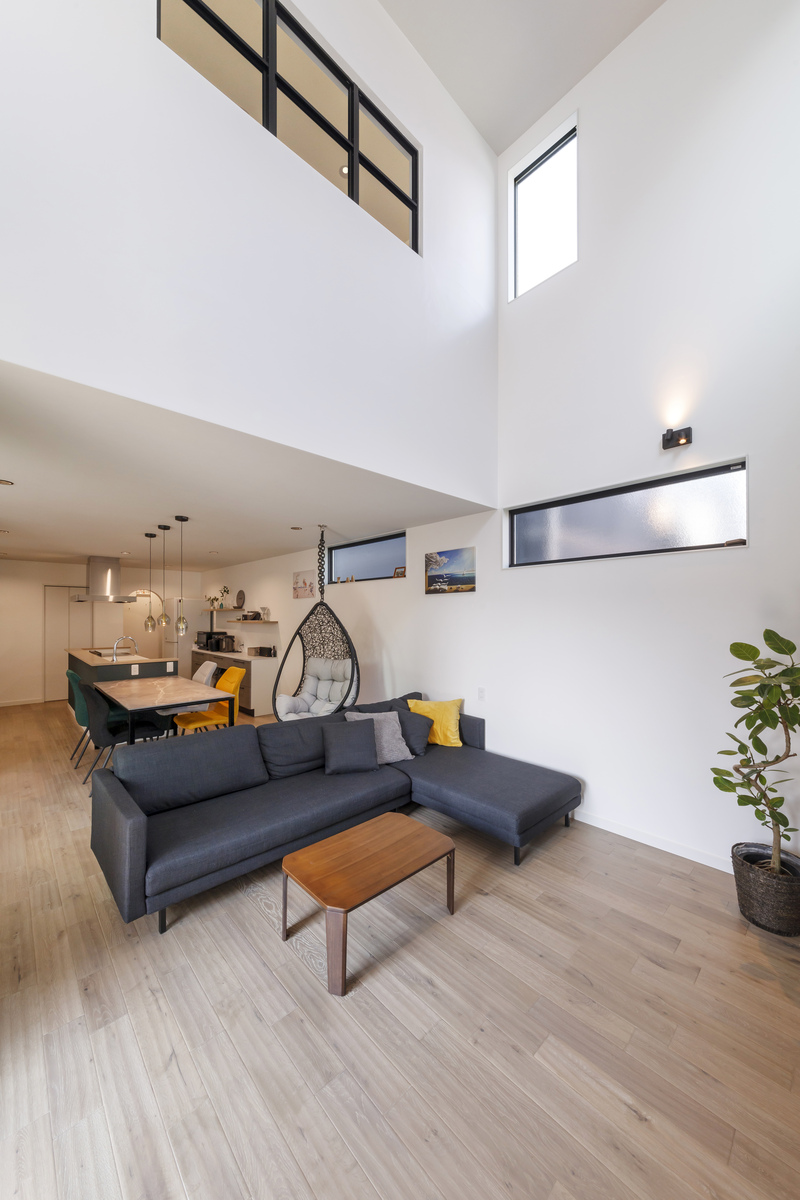 時間がゆるやかに流れるLDK。旅行先のホテルで奥さまが一目惚れしたハンギングチェアを吊り下げ、スマホやテレビを見たり、まどろんだり、心からリラックスできる空間です。隣家に囲まれていますが、リビングに高い吹抜けを設け、中庭から十分な光を取り込むことで明るい空間を実現しました。
