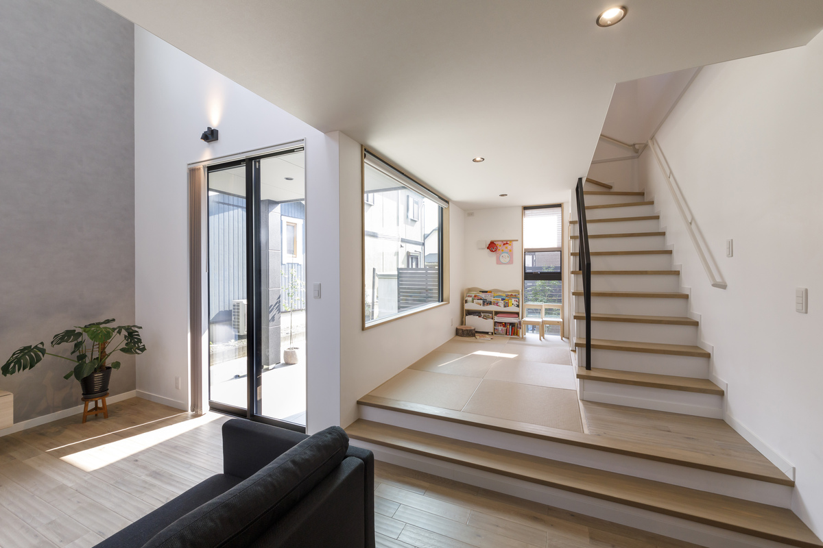 リビング階段と小上がりの和室がセットになったファミリースペース。キッチンで料理しながら目が届くので安心です。階段下は収納スペースになっています。和室に2.4m幅のFIX窓を採用し、四季折々の庭の景色を眺めながらゆったりくつろぐことができます。