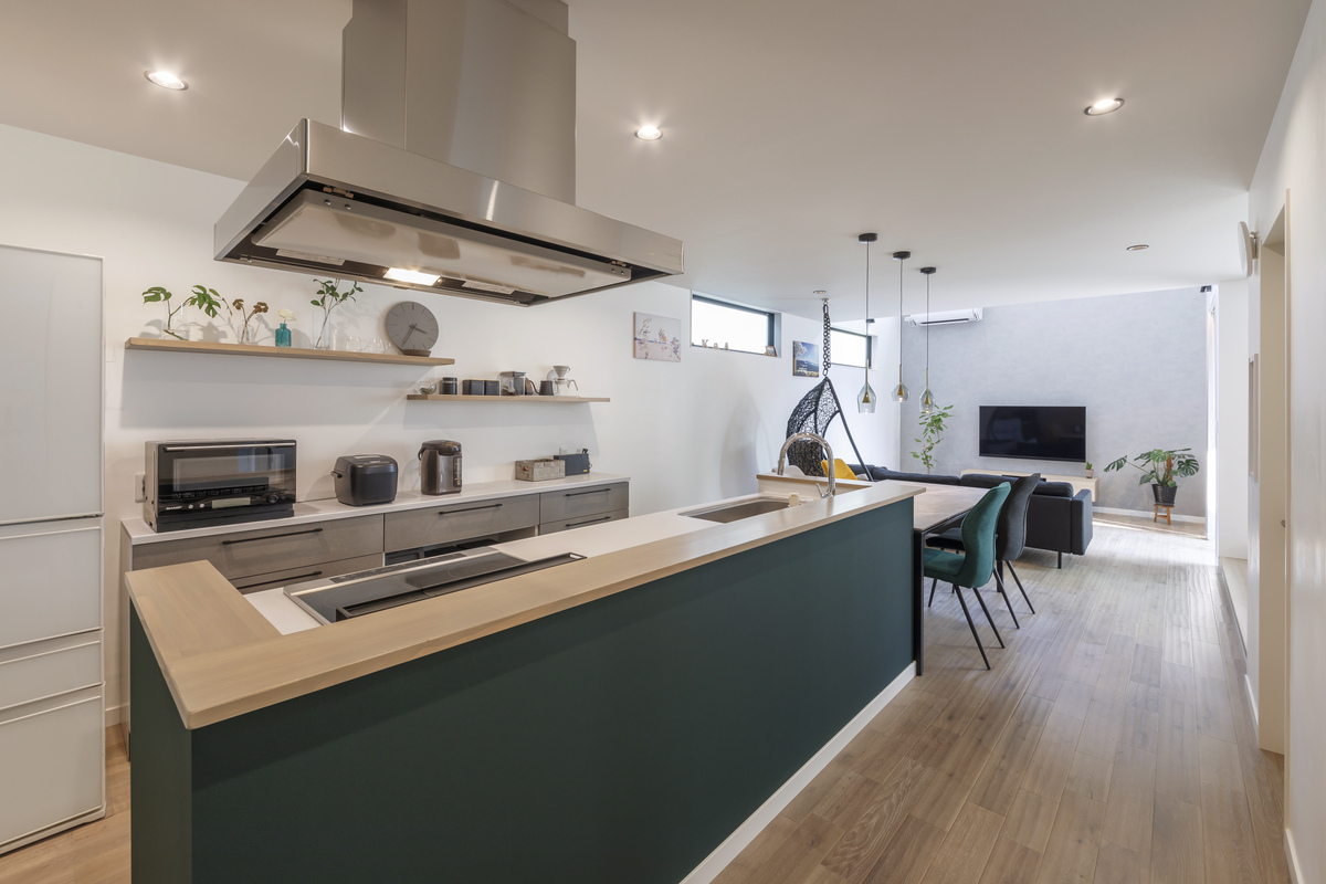 腰壁を高すぎないようにして圧迫感を軽減したキッチン。ダイニングテーブルと横並びにレイアウトすることで家事効率を高めました。