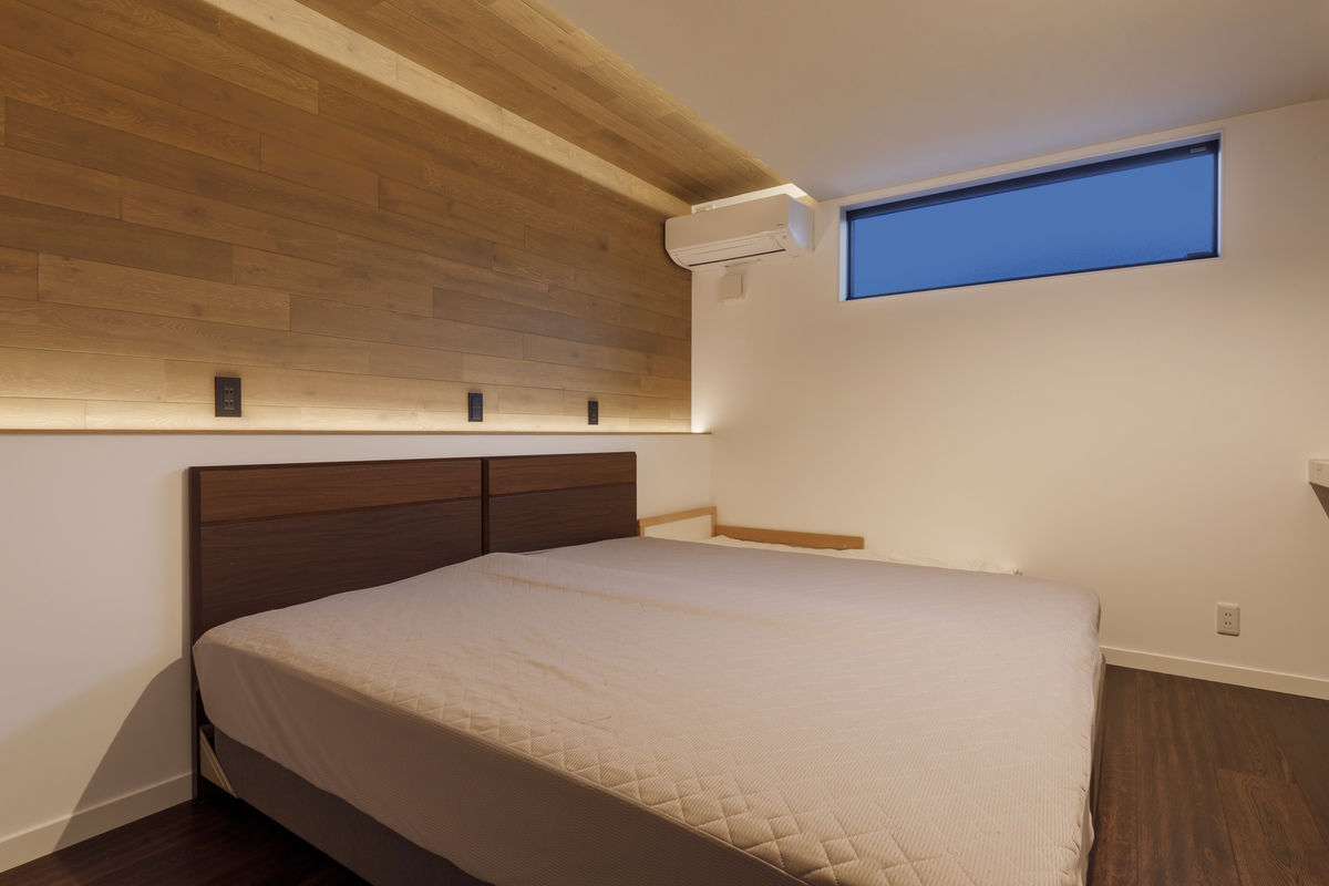 主寝室の壁の一部に無垢の杉板を貼ってアクセントをつけました。木のあたたかみと漆喰に包まれたナチュラルな空間が深い眠りへと誘います。