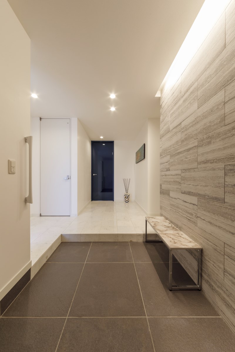 ゆったりとした白いエントランスホールは、アートギャラリーのような凛とした空間を創出します。ネイビーのリビングドアを開けるとどんな世界が広がっているのか、期待に胸が膨らみます。