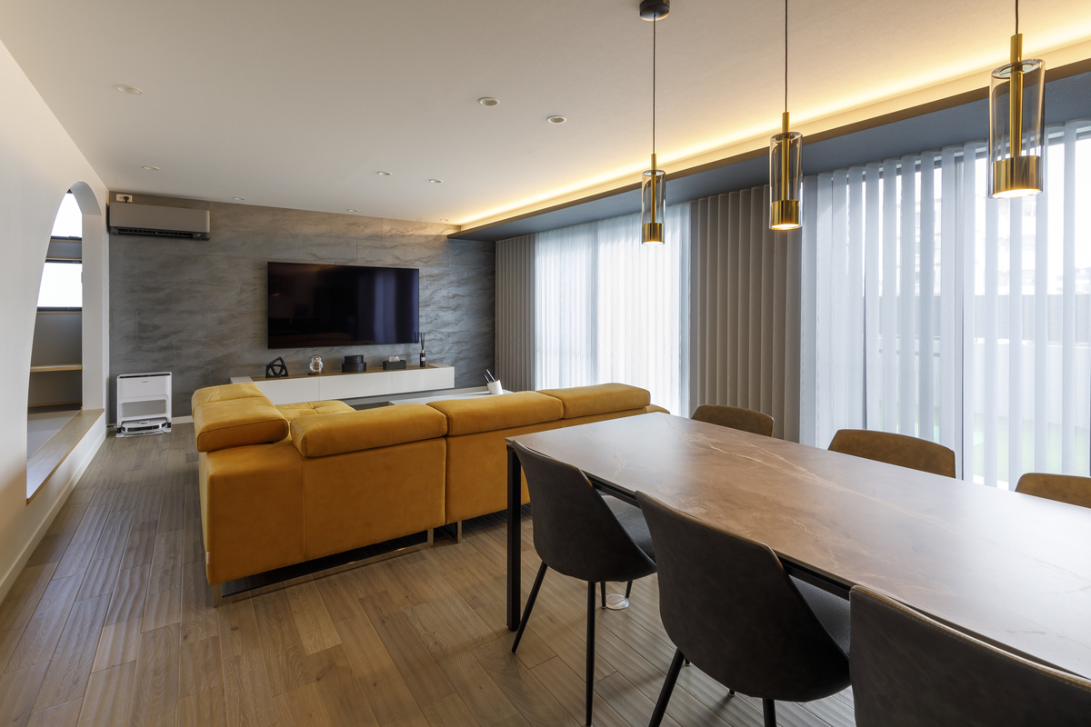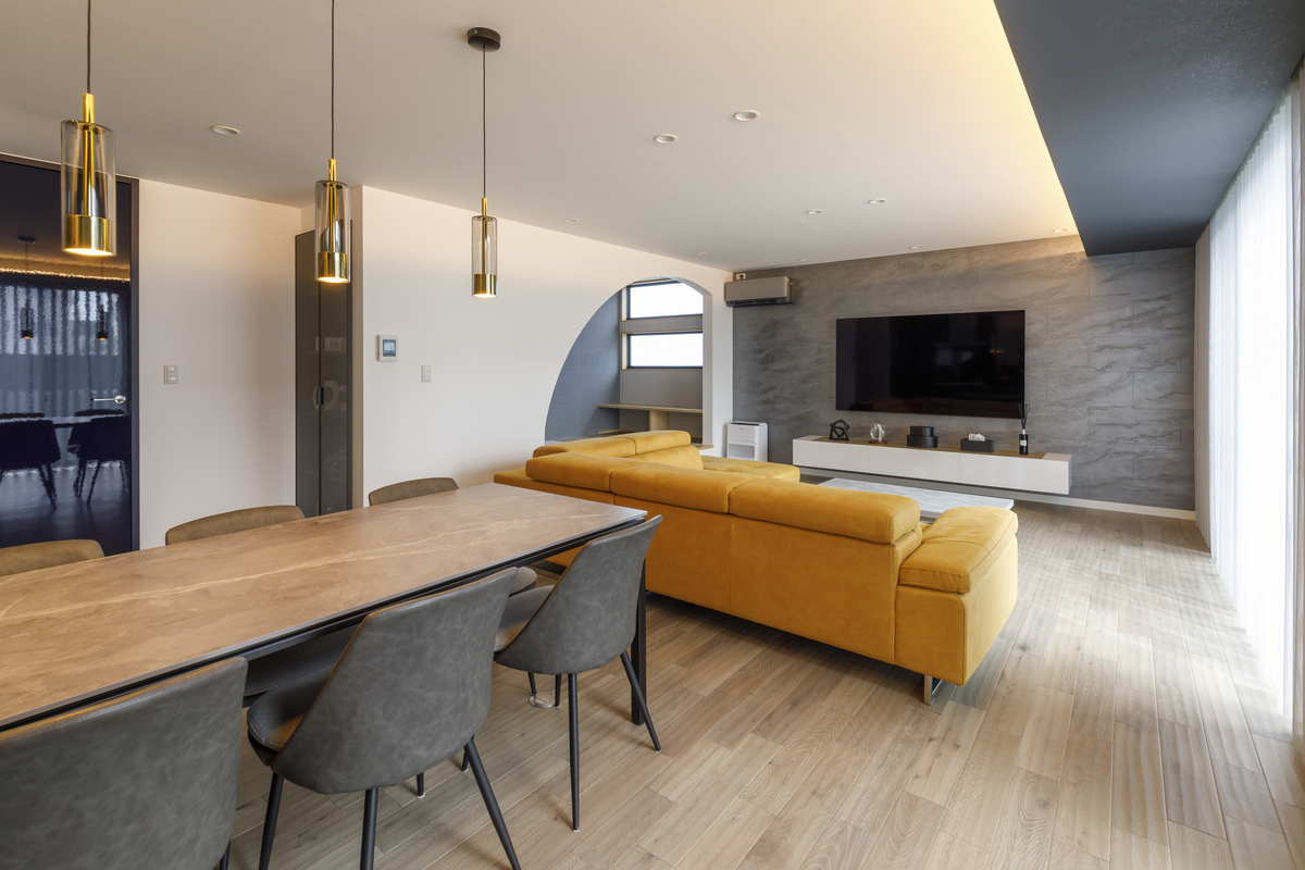 家具、照明、アートをトータルにデザインした28畳のLDK。ハニーレモン色のソファをはじめ、どこを見ても高い審美眼で選ばれた一つひとつの素材が美しく調和し、言葉にできない心地よさを感じます。