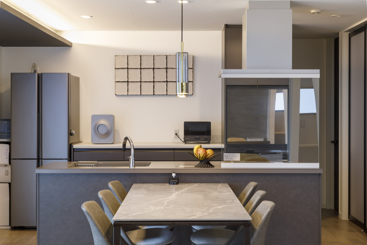 奥さまがショールームで一目惚れしてセレクトしたアイランドキッチン。ダイニングテーブルもチェアも冷蔵庫もすべてグレーで統一されています。カップボード上のオブジェのような装飾品にもセンスを感じます。