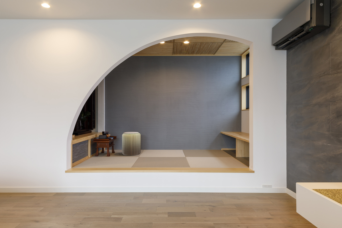 シームレスな曲線美を活かした小上がりの畳コーナーは仏間兼用。お坊さんがお経を唱える間、ご夫婦の足がしびれないよう木製のベンチを造作しました。