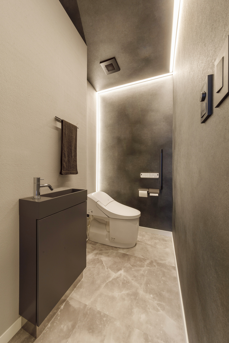 玄関ホールに近い場所に設けたゲスト専用のレストルーム。非日常とも言える豪華な空間は、色、素材、スイッチ、照明計画などディテールにまでとことんこだわっています。