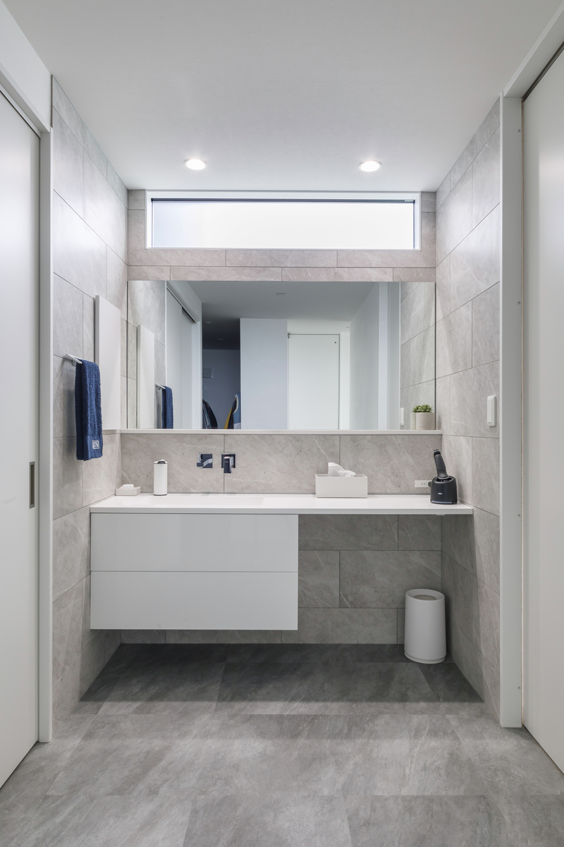 キッチンから近い動線上にある手洗いコーナー。グレーのタイルにnattoku住宅オリジナルの宙に浮かぶような洗面台が絶妙に馴染んでいます。右の引き戸を開けるとゲストルームへとつながります。