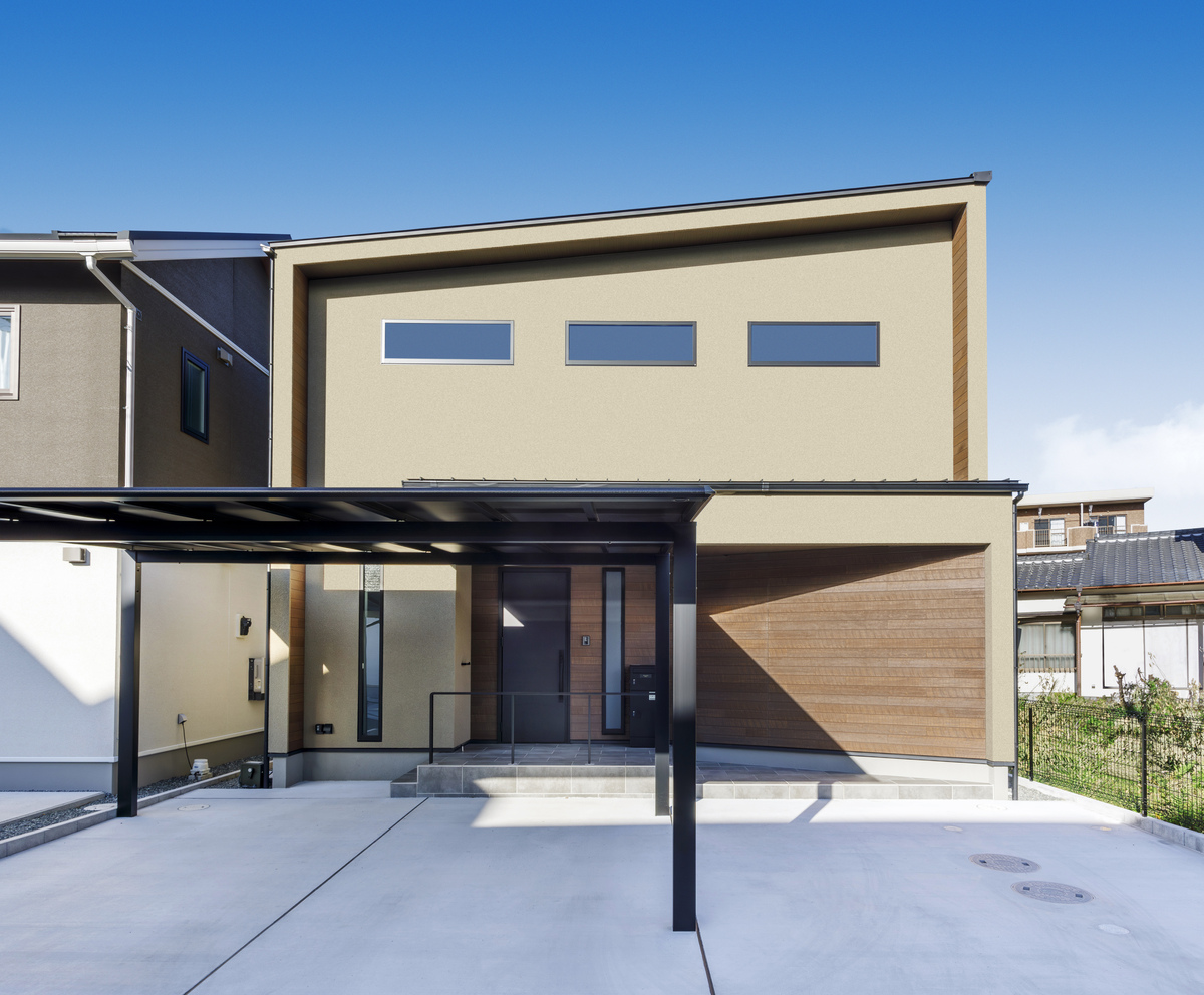 アースカラーの外壁がやさしさとぬくもりを演出する和モダンスタイルの外観。袖壁とラインの揃った窓のコントラストが絶妙で、何年経っても飽きのこない佇まいが素敵です