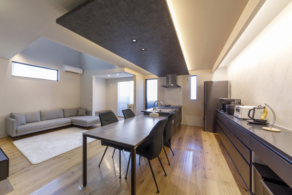 スタイリッシュ&モダンな雰囲気にコーディネートされた20畳のLDK。グレーのダイニングテーブルセット、L字型のソファは『nattoku住宅』のオリジナルアイテムです。