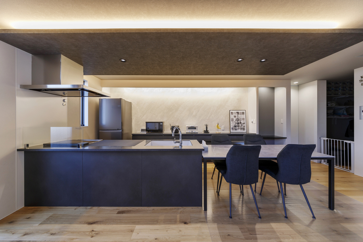 キッチン背面の壁にイタリア漆喰「ユーロスタッコ」を施しアートな雰囲気を演出しました。下がり天井、間接照明との相性もぴったりです。