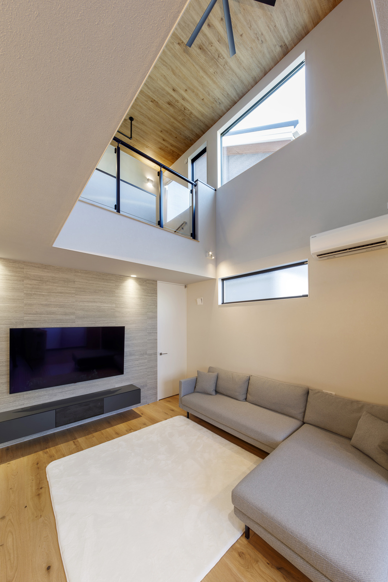 開放感あふれる吹き抜けのリビングはご夫婦のいちばんのお気に入り。ソファをテレビに向かって配置せず、壁付けのレイアウトに。中央に視線が向くので、LDKのどこにいても自然と会話が生まれます。