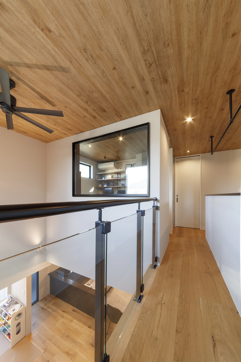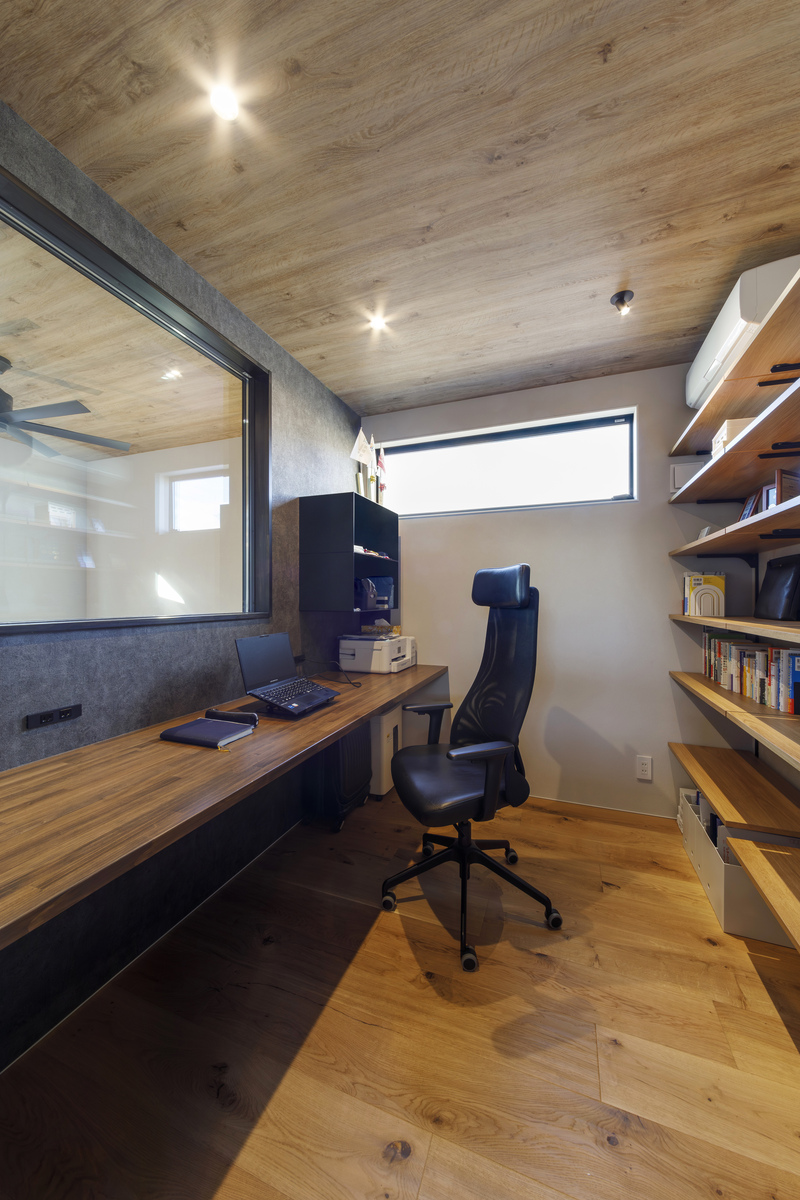 ご主人の書斎は仕事部屋としても大活躍。吹き抜けに面して大きなFIX窓を設置したことで閉塞感がなく、リモートワークもはかどるそうです。長いカウンターと大容量の本棚を造作しました。