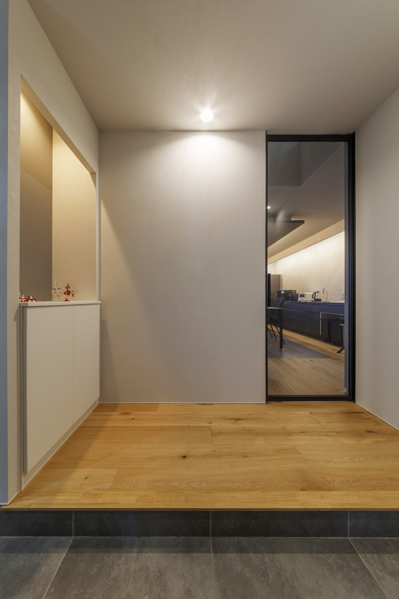 シンプルな中にもセンスが光るエントランス。天井まで届く透明ガラス入りのリビングドアに視線が抜けていくため、空間がより開放的に感じられます。間接照明の当て方にもプロのひと工夫が見られます。