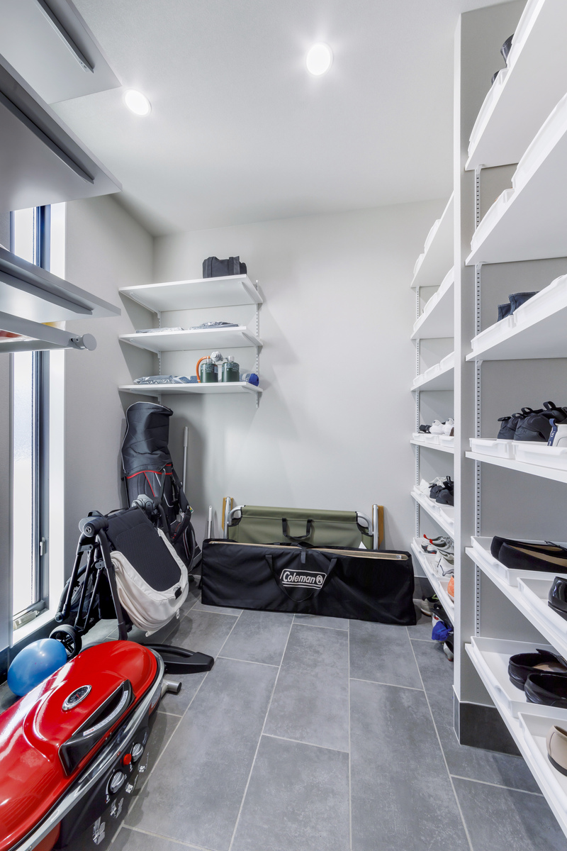 キャンプ用品やBBQセット、ゴルフバッグなどのアウトドアグッズをすっぽり収納できる土間収納。ベビーカーもスムーズに収納できます。シューズクローゼットに可動棚を造作し、整理整頓しやすくしました。