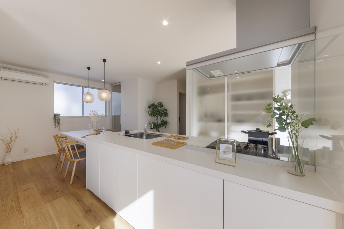 大容量の収納を備えたホワイトのキッチン。キッチン背面には水周りを集約し、スムーズに家事をこなせる動線になっています。
